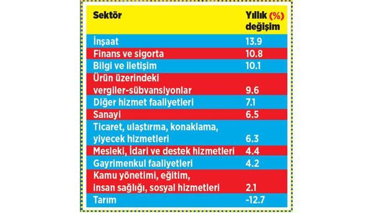 GSYH’yi oluşturan faaliyetler incelendiğinde; 2025 yılı üçüncü çeyreğinde bir önceki yıla göre zincirlenmiş hacim endeksi olarak inşaat yüzde 13.9; finans ve sigorta faaliyetleri yüzde 10.8; bilgi ve iletişim faaliyetleri yüzde 10.1; ürün üzerindeki vergiler eksi sübvansiyonlar yüzde 9.6; diğer hizmet faaliyetleri yüzde 7.1; sanayi sektörü yüzde 6.5; ticaret, ulaştırma, konaklama ve yiyecek hizmetleri yüzde 6.3; mesleki, idari ve destek hizmet faaliyetleri yüzde 4.4; gayrimenkul faaliyetleri yüzde 4.2; kamu yönetimi, eğitim, insan sağlığı ve sosyal hizmet faaliyetleri yüzde 2.1 arttı. Tarım sektörü ise yüzde 12.7 daraldı.