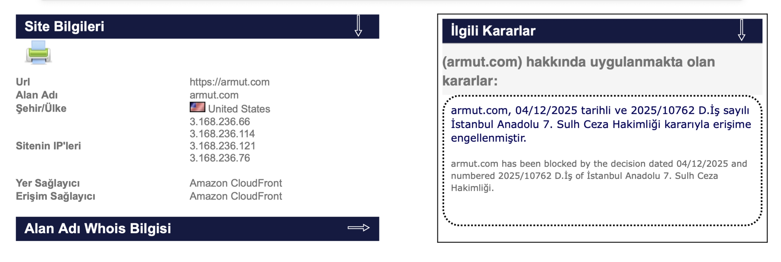 Türkiye’nin en popüler online hizmet platformlarından Armut.com, mahkeme kararıyla erişime engellendi. Armut.com web sitesi ve mobil uygulamasına erişim sağlanamıyor. Bilgi Teknolojileri Kurumu (BTK) tarafından paylaşılan bilgilere göre Armut.com, 04/12/2025 tarihli ve 2025/10762 D.İş sayılı İstanbul Anadolu 7. Sulh Ceza Hakimliği kararıyla erişime engellendi.