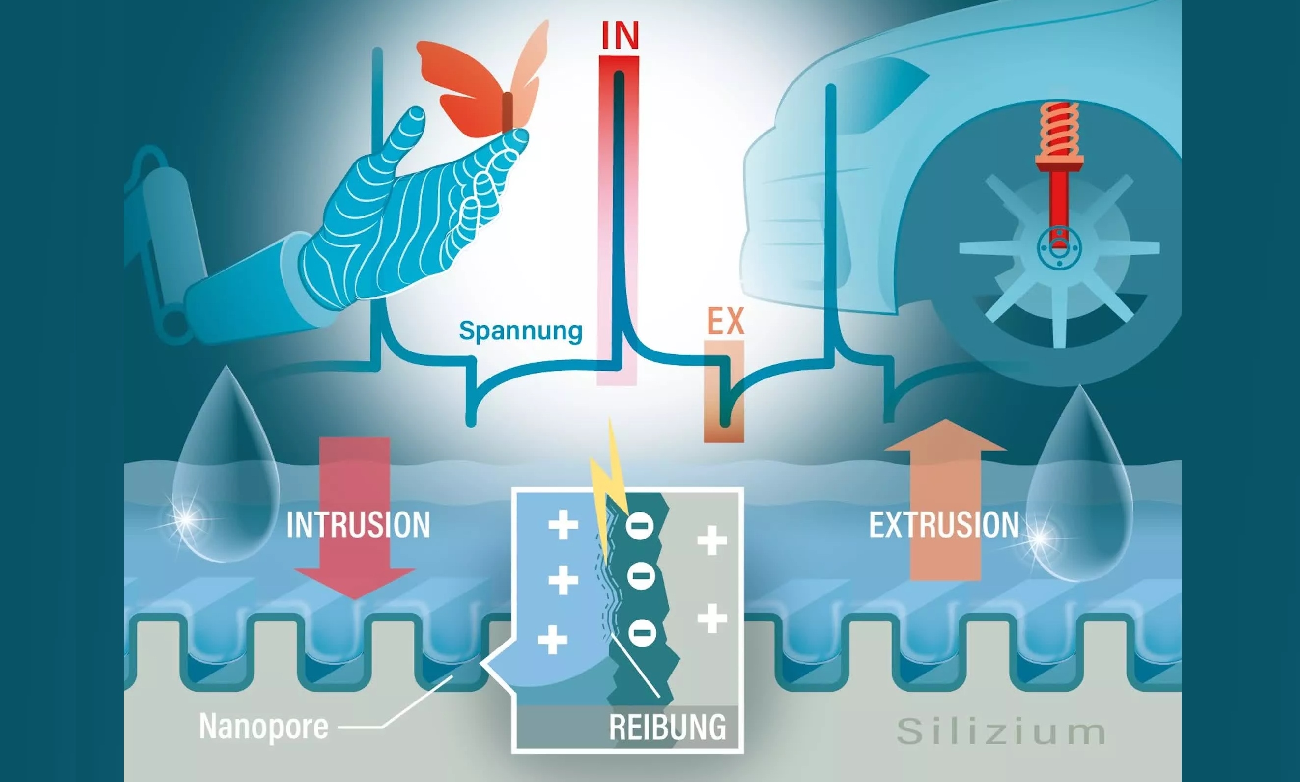 Cihazın merkezinde, elektrik iletebilen, nanometre boyutunda gözeneklerle işlenmiş ve suyu iten bir silikon yapı bulunuyor. Bu yapı sayesinde suyun gözenek ağına giriş ve çıkış hızları kontrol ediliyor ve triboelektrik etki stabil biçimde ortaya çıkarılıyor. Su gözeneklerin içine itildiğinde ve geri çekildiğinde, sıvıyla katı yüzey arasındaki temas yük oluşturuyor. Cihaz da bu yükü kaybetmeden kullanılabilir bir elektriğe dönüştürüyor.