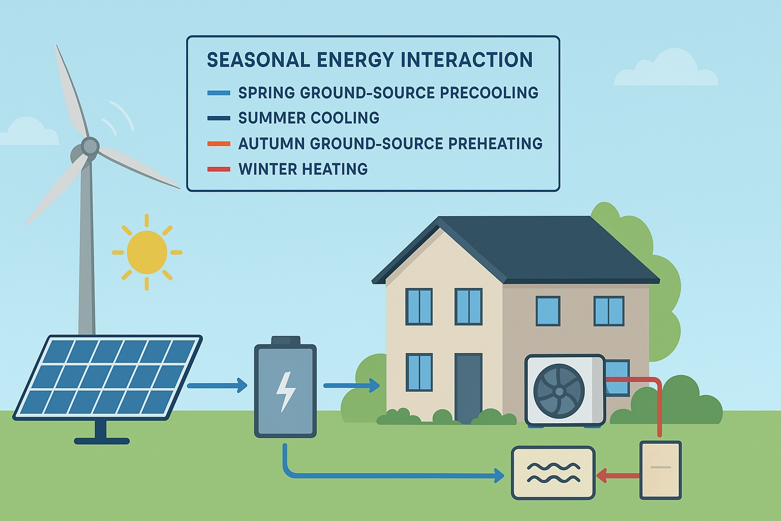 Sistem, termal ve elektrik enerjisi depolamayı bir araya getirerek konutlarda enerji kullanımını optimize ediyor. İlkbaharda yer altından ön soğutma, yazın soğutma, sonbaharda yer altından ön ısıtma ve kışın ısıtma sağlıyor. Araştırmacılar, ısı pompasının performansını artırmak için TRNSYS ve SketchUp gibi gelişmiş yazılım araçlarıyla optimize edilmiş bir enerji yönetim stratejisi geliştirdiklerini belirtiyor.