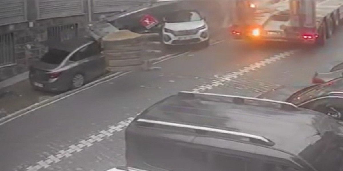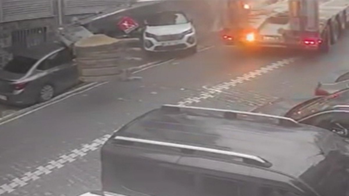 Görüntülerde tırın taşıdığı iş makinesinin devrildiği ve kepçesinin park halindeki 2 otomobil ile motosikletin üzerine düştüğü görülüyor.