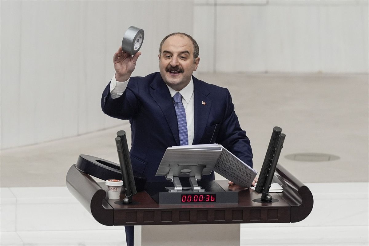 Türkiye’nin teknolojide geldiği nokta ile CHP’nin içinde bulunduğu durumu kıyaslayan Varank yanında uzay çalışmalarında kullanılan itki yakıtı ve bantla kürsüye çıktı.